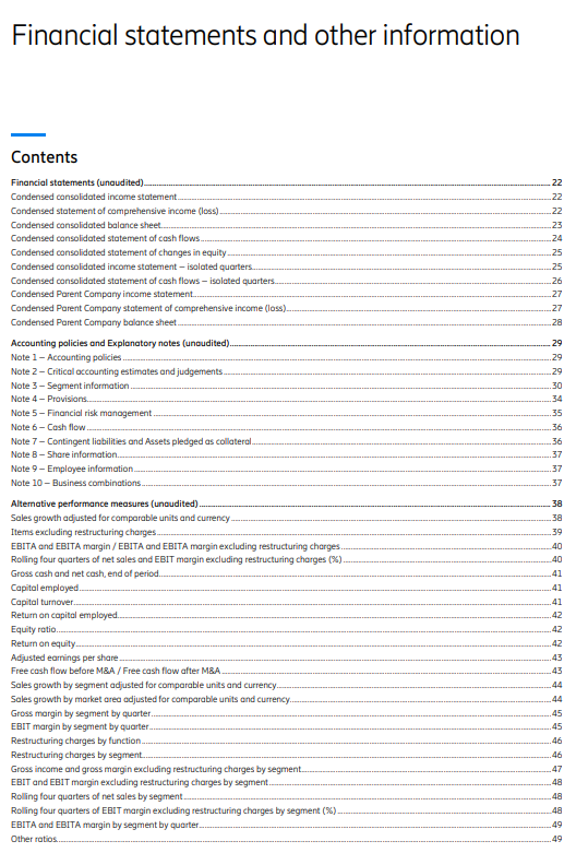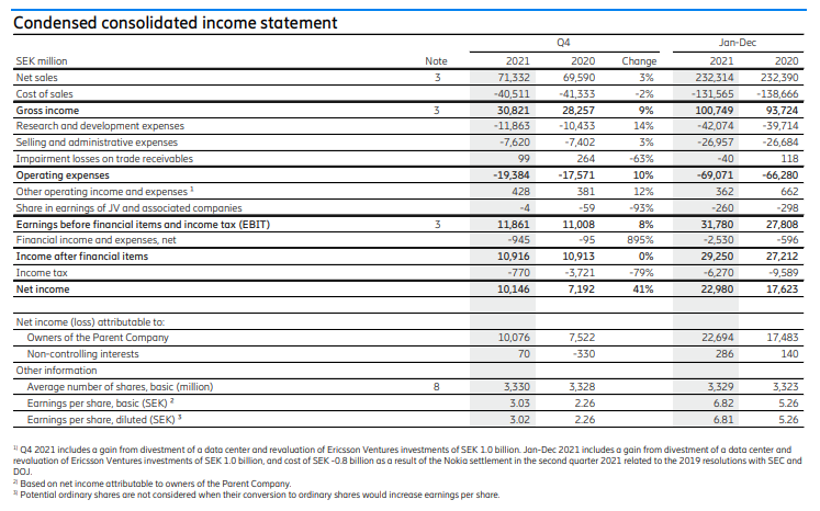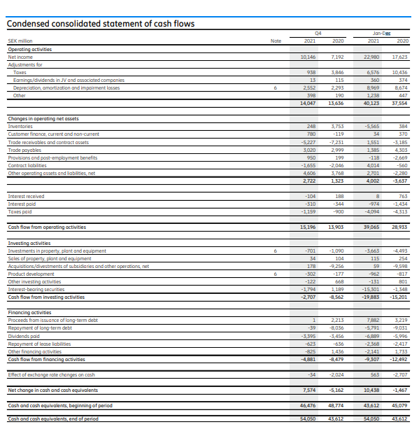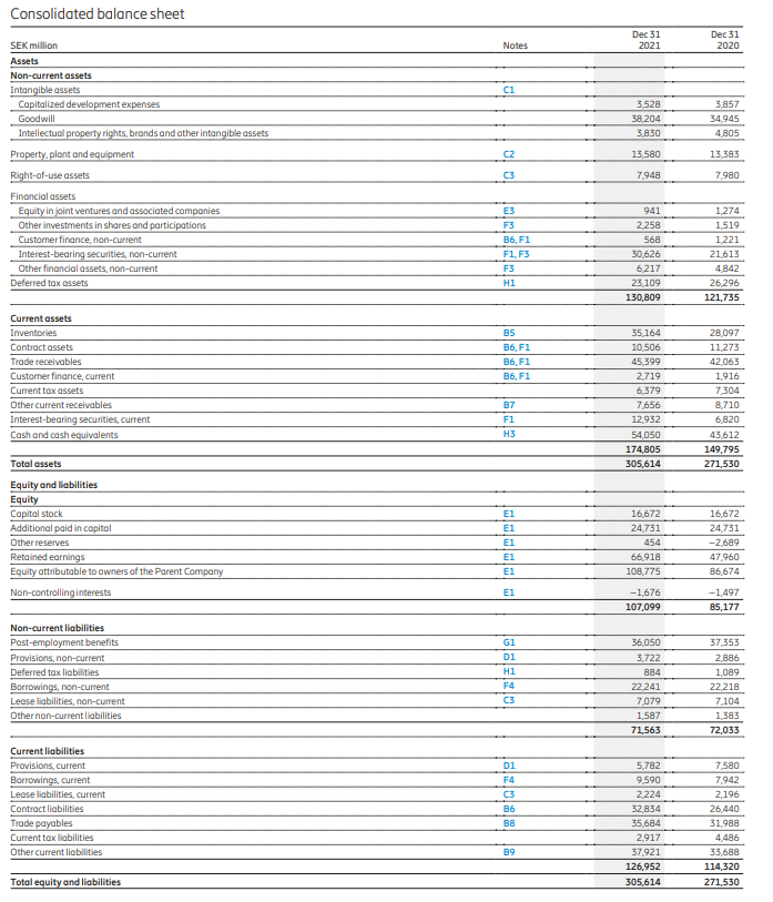 에릭슨 2021 AR(Aannual Report) 자료의 재무상태표를 예시로 들어보겠다.